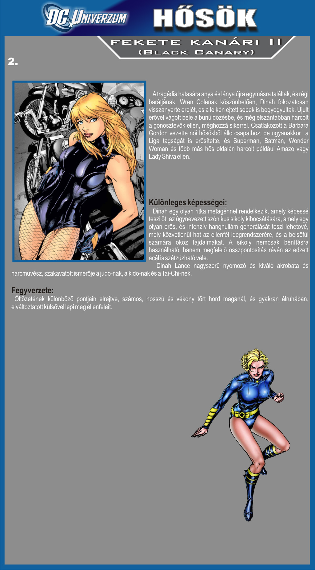 Fekete Kanári az egyik legképzettebb harcművész a világon, ráadásul rendelkezik egy olyan szónikus sikollyal, amellyel szó szerint falakat képes áttörni. Tagja az Igazság Ligájának, és időnként a Zöld Íjász barátnője.