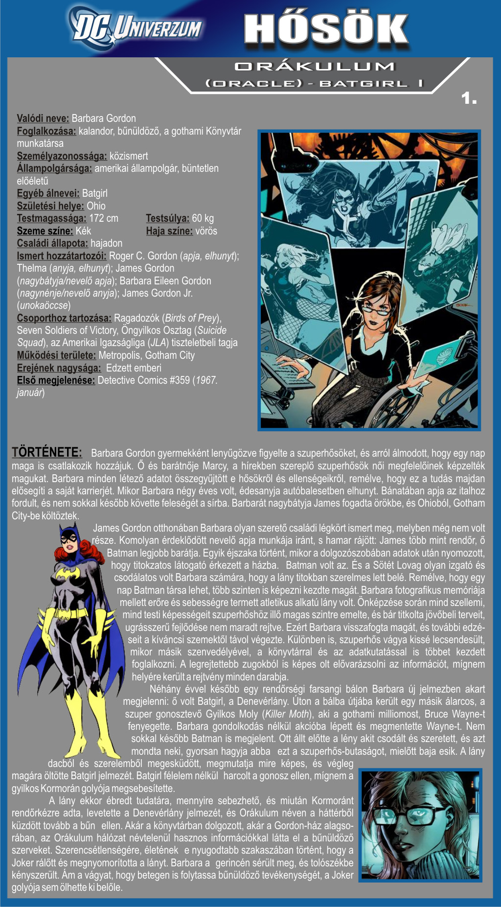 Ősszel jelenik meg az új sorozatunk első száma. A Ragadozók egy szuperhős csapat nevét takarja, amely történetünk kezdetén még csak kettő, illetve három tagból áll. A későbbiekben bővülni fog ugyan, de most vessünk egy pillantást az egyik alapítótagra. Ő nem más, mint Orákulum, a korábbi Batgirl, a szuperhősök segítője, informátora, akit Joker lőtt le (a magyarul is megjelent Gyilkos Tréfa című történetben láthattuk - Batman 1. szám), és aki azóta tolószékbe kényszerülve kénytelen más módot találni rá, hogy Gothamben a bűn ellen harcoljon.