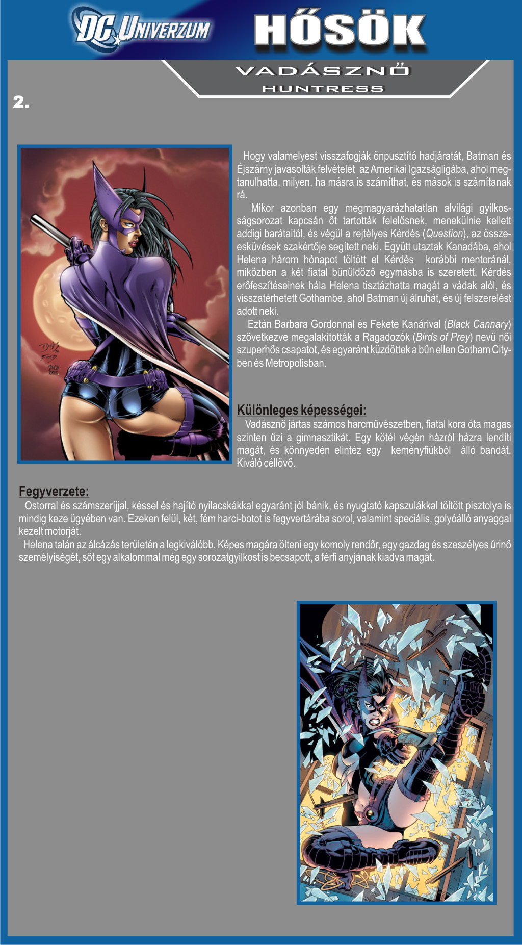 A trió legérdekesebb tagja nem más, mint a Vadásznő. Vele többször találkozhattunk már különböző Batman-történetekben, de mindig csak mellékszereplőként. Most kiderül róla minden, hogy mit miért tesz, honnan jött, mi a célja, és főleg, hogy milyen személyiség. Helena Bertinelli olasz származású, egy maffiafőnök lánya és munkaidőben tanárnő egy iskolában.